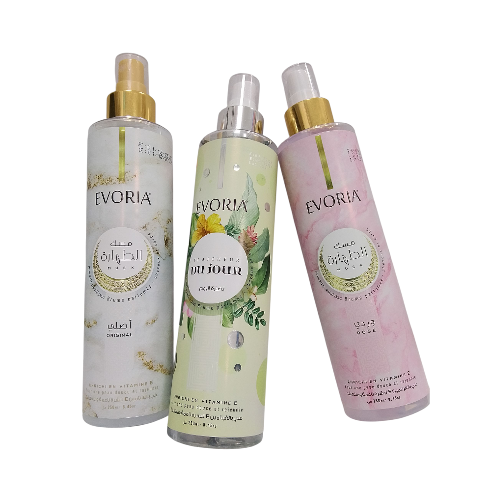 تقدم مجموعة EVORIA 250ML من الرذاذات المعطرة العديد من الروائح، لا سيما الفواكه والزهور والذواقة، المصممة لتعطير البشرة والشعر بمهارة. وهي غنية بفيتامين E لخصائصها المرطبة.
