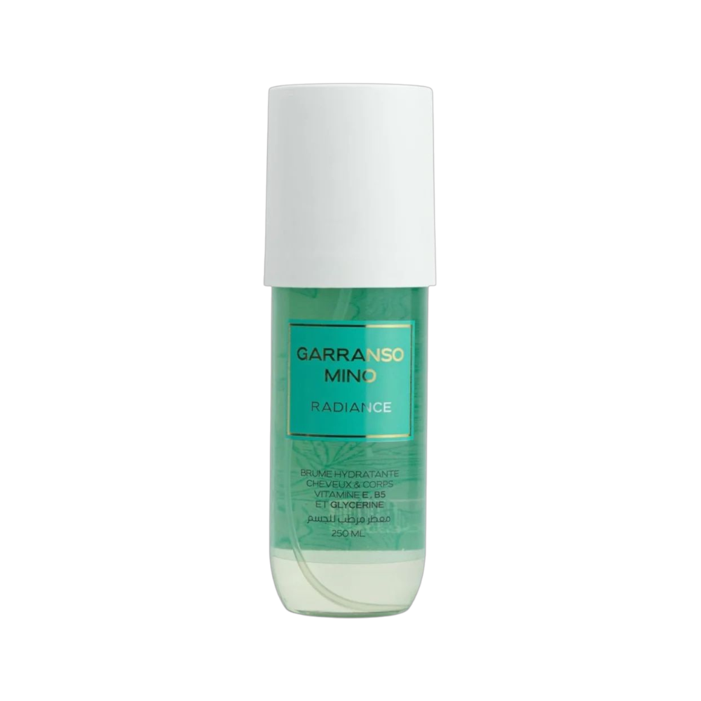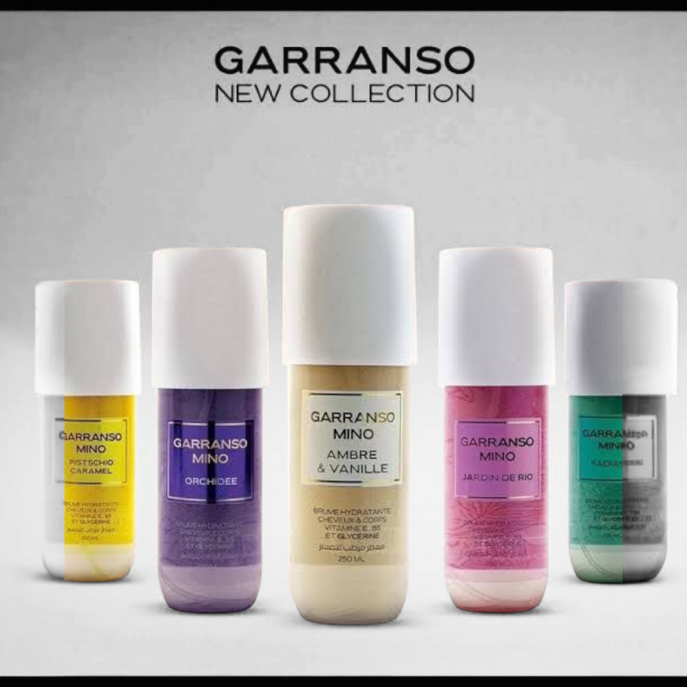 تم تصميم رذاذ جارانسو مينو المرطب المعطر 250 مل للجسم والشعر وهو غني بفيتامين E وB5 والجلسرين. وهو متوفر في العديد من العطور، أبرزها Orchidée، Pistachio Caramel، Jardin de Rio، Amber & Vanille، وRadiance.