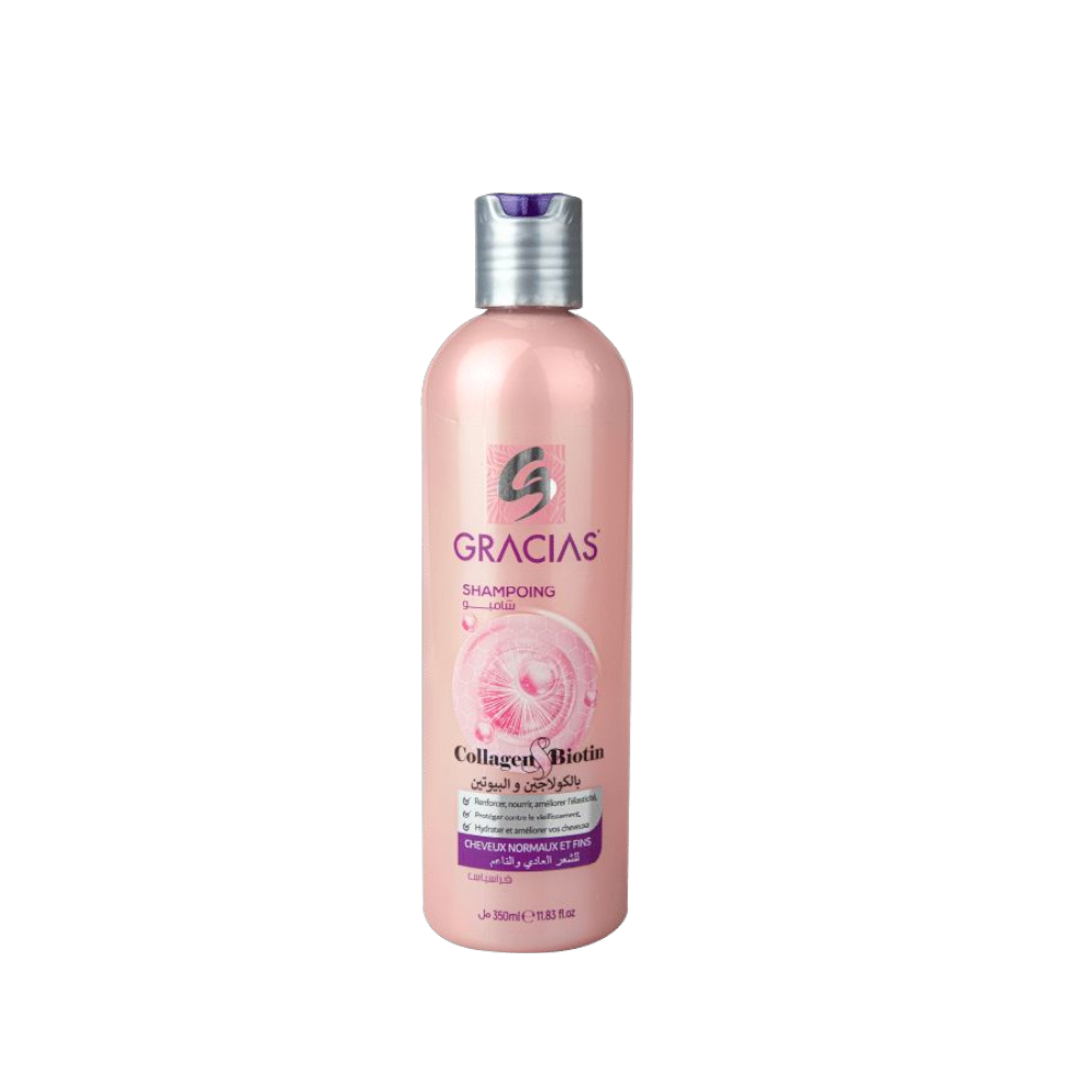 تم تركيب شامبو بلسم GRACIAS (على ما يبدو التهجئة الصحيحة من GRVCIVS) Biotin & Collagen 350 ml لتنشيط الشعر، مما يجعله أكثر سمكًا وأقوى بشكل واضح.