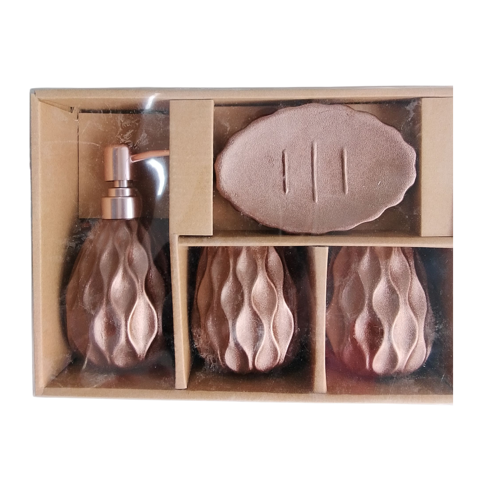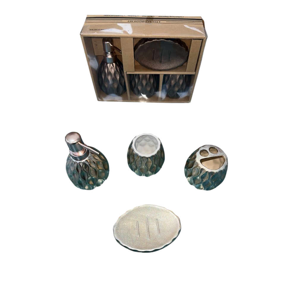 طقم حمام منزلي من هومز (Homez Stone): طقم فخاري مكون من 4 قطع يتوفر للشراء عبر الإنترنت.