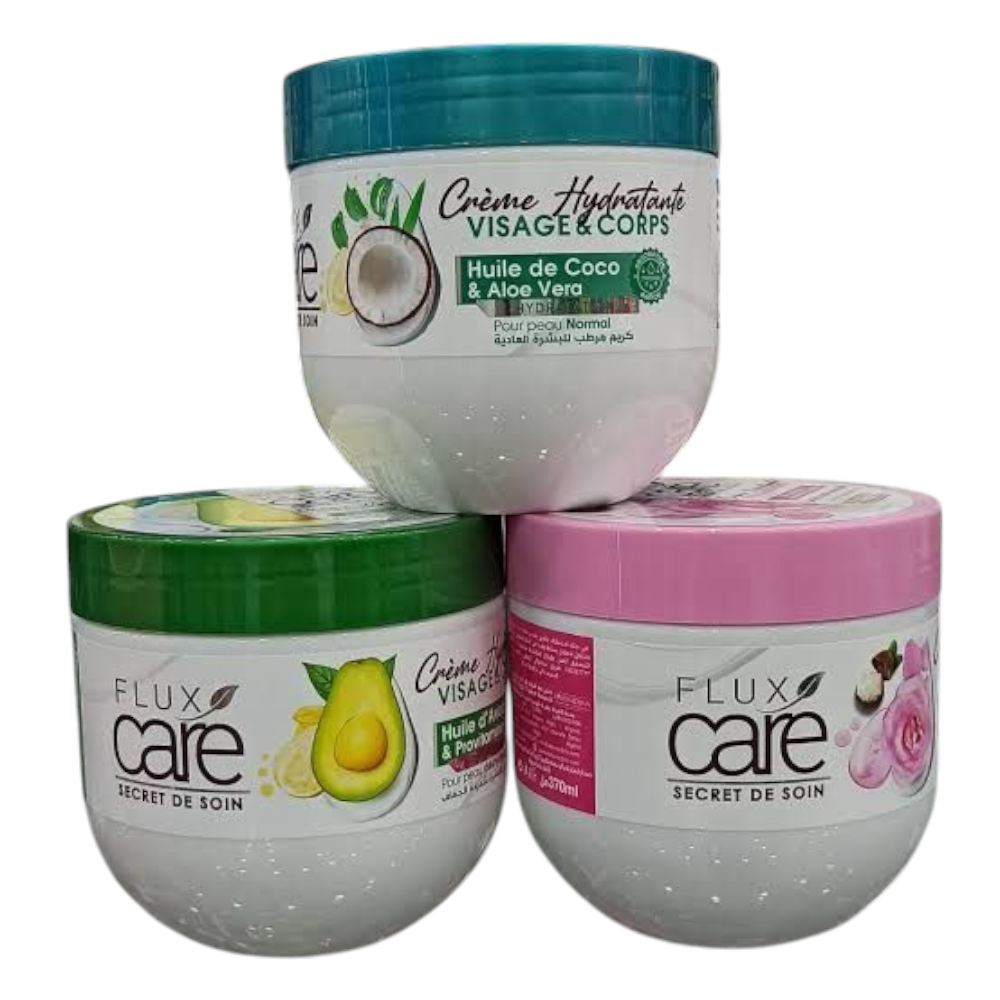مرطب Flux Care 370ml هو كريم مغذي للوجه والجسم، متوفر في عدة أشكال تستهدف أنواع البشرة المختلفة ومشاكلها (فيتامين سي وعسل الزهور وماء الورد وزبدة الشيا وزيت جوز الهند والصبار، إلخ).
