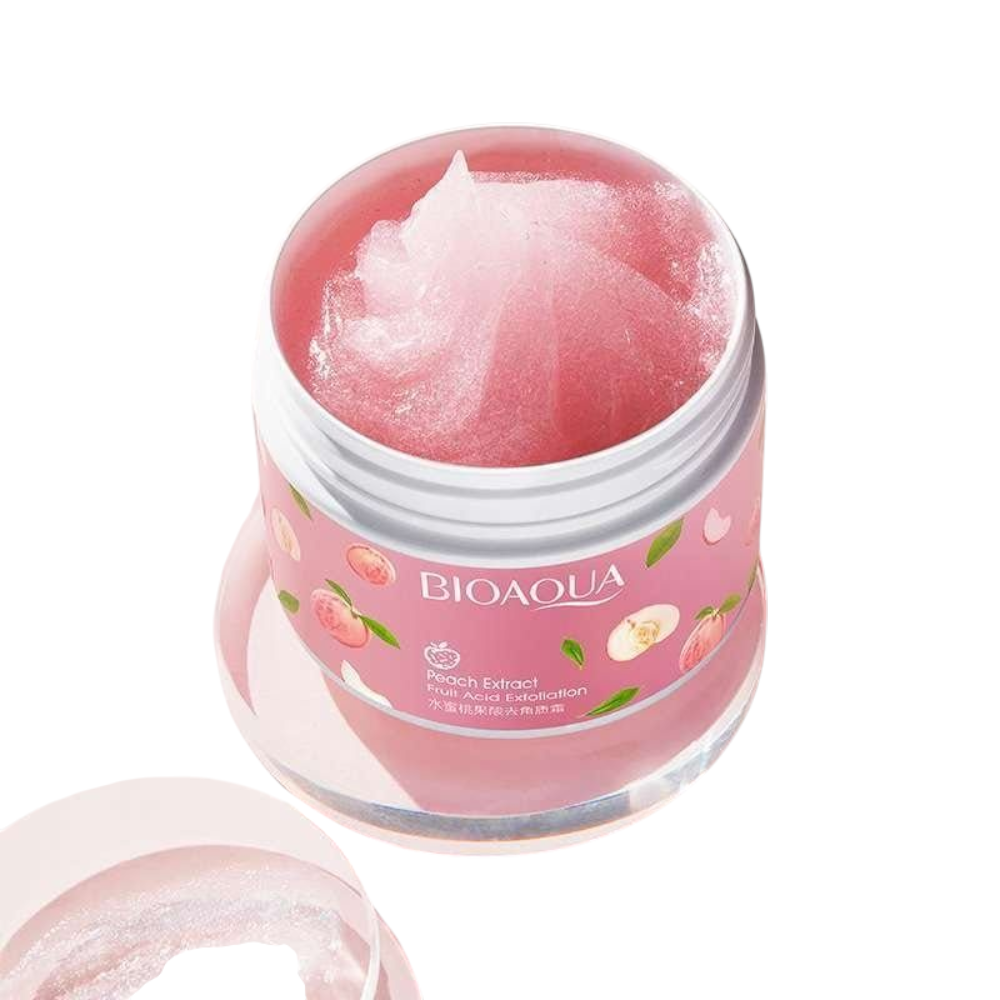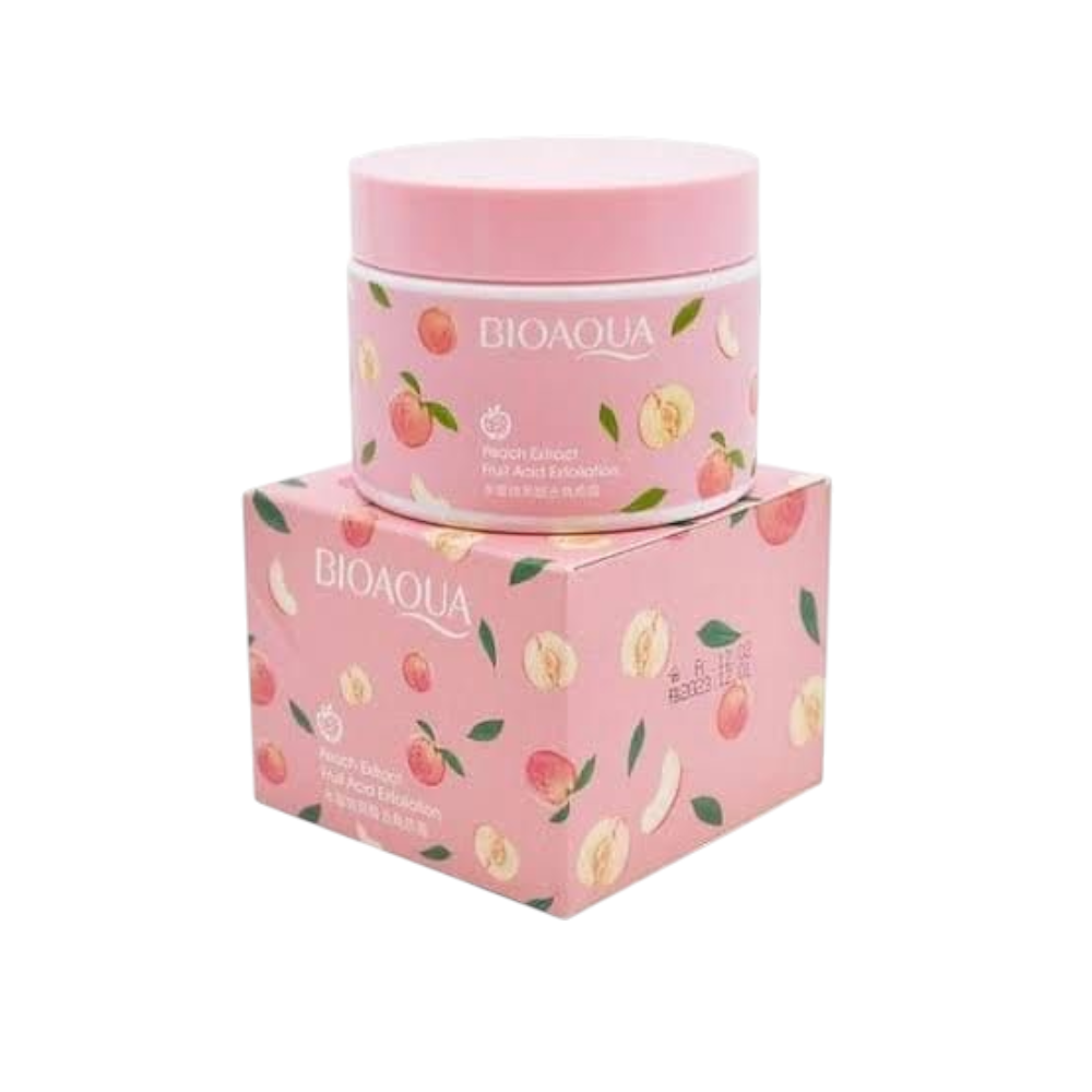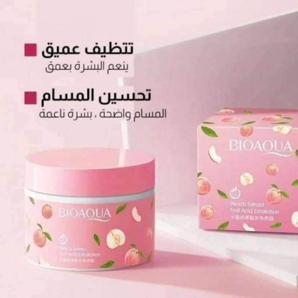 منتج BIOAQUA 140g عبارة عن كريم أو جل مقشر يحتوي على مستخلص الخوخ وحمض الفاكهة،