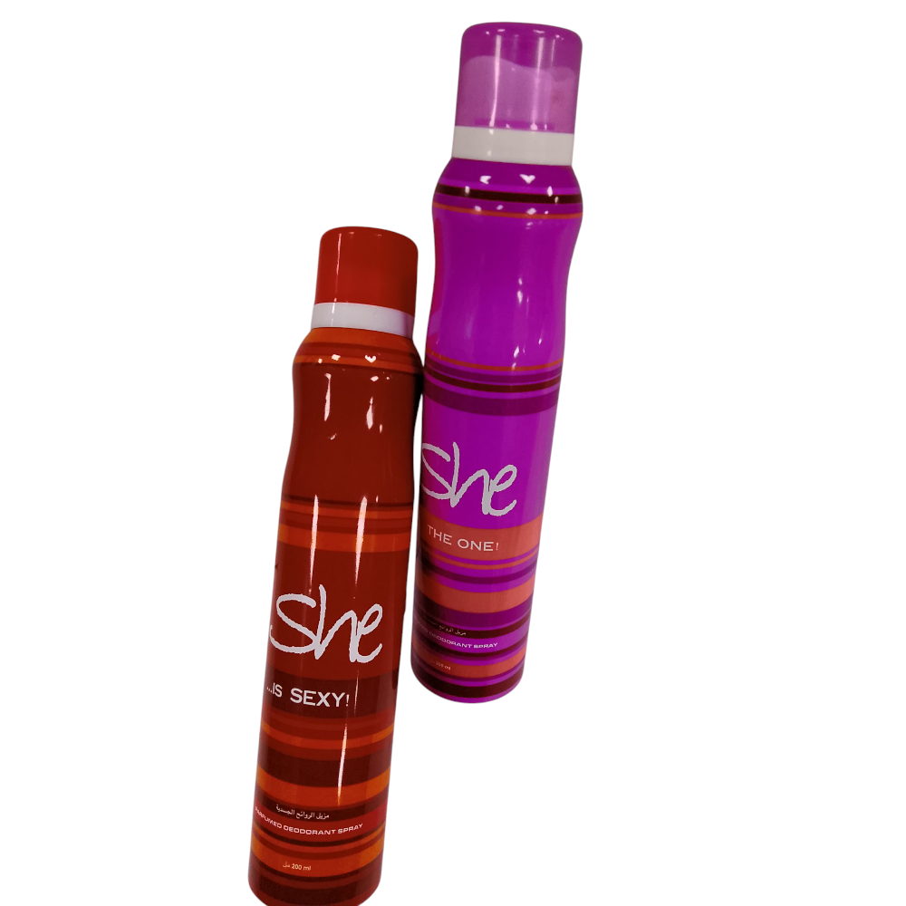 تقدم العلامة التجارية “She” العديد من مزيلات العرق على شكل رذاذ سعة 200 مل، وهي مخصصة للنساء بشكل أساسي.