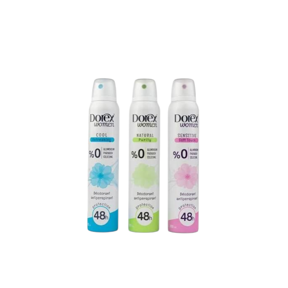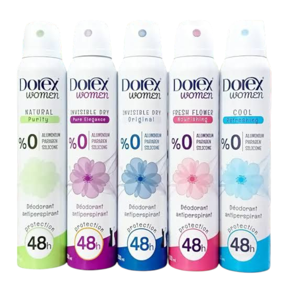 حماية لمدة 48 ساعة: توفر معظم المتغيرات، مثل مزيل العرق Dorex للنساء Invisible Dry Pure Elegance 48h ومزيل العرق Dorex للرجال Powder Soft Essence 48h، حماية فعالة ضد العرق والروائح لمدة 48 ساعة.