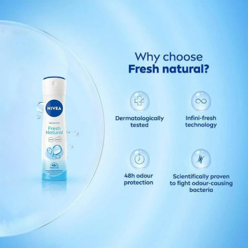 رذاذ نيفيا الطبيعي الطازج: يوفر مزيل العرق هذا (للنساء) إحساسًا دائمًا بالانتعاش الطبيعي بفضل المستخلصات البحرية. يوفر حماية مزيل العرق لمدة 48 ساعة مع كونه لطيفًا على البشرة.